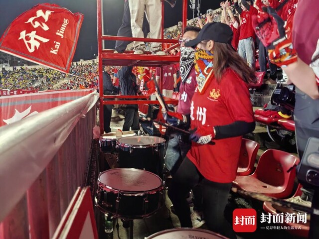 在达州与遂宁的比赛中,这首《只为达州》声音震耳欲聋,球迷席第一排,肖梅身着印着“达州”字样的红色体恤,戴着黑色帽子和手套,半蹲敲鼓,节奏时快时慢,尽管下着小雨,她脸上仍冒出了汗水,“为达州荣誉而战,完全不累!”