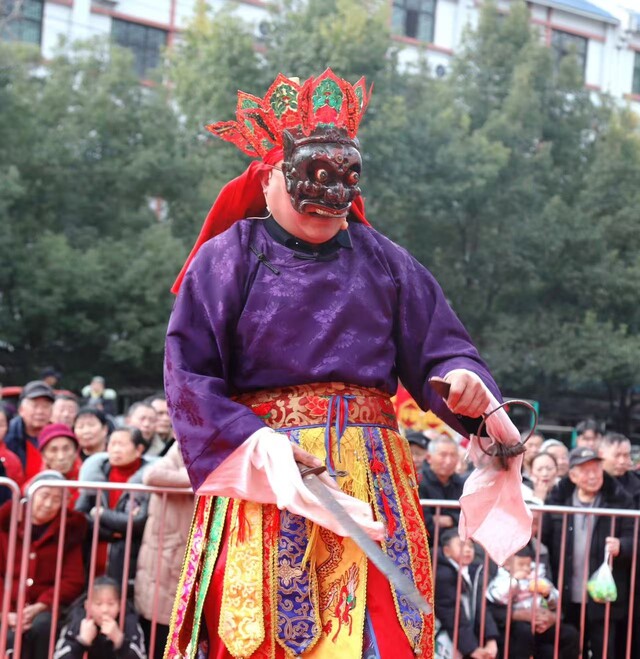 暮色四合,戏台上人影跃动,牛角声苍凉悠远,穿透山野的寂静,头戴彩绘木面具的端公戏传承人张贵洲踏着传统“搓步”翩然起舞,手中司刀的铜铃声与台下如潮的喝彩交织共鸣。