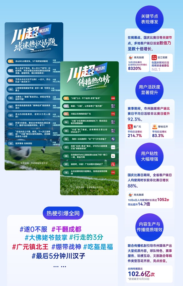 技术筑基、传播赋能、人才驱动三大体系的深度融合,形成了数据驱动、网络协同、机制保障的智能化运行模式。该模式推动“川超”赛事全网总传播量突破95亿次,全省市州融媒客户端日活最高提升214%,人均使用时长增长14.7倍,充分体现“平台引导、全域共创”的协同效应与创新活力。