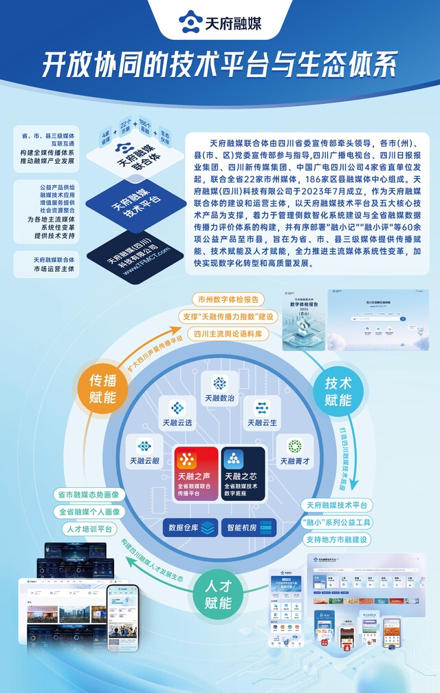 天府融媒技术平台(以下简称“平台”)是由四川省委宣传部牵头领导建设的天府融媒联合体的省级技术平台。历经两年数字化建设,平台实现从技术支撑到智能赋能的关键跨越,以智能化、平台化引领“媒体转型”的鲜明特征,助力全省主流媒体系统性变革。