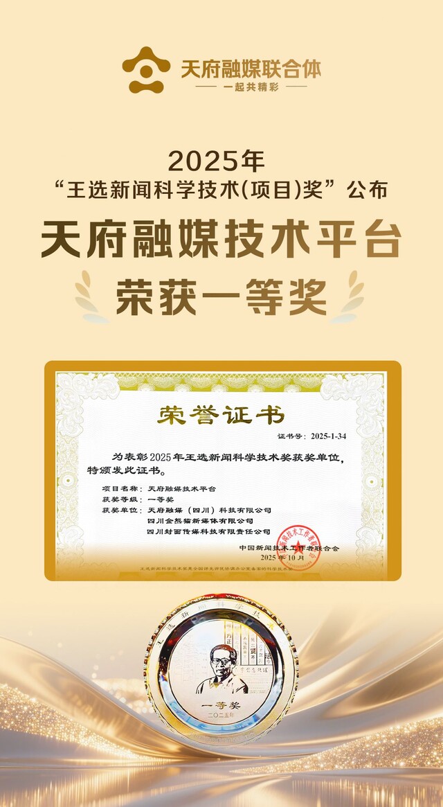 10月31日,2025年“王选新闻科学技术奖”(项目奖)正式揭晓并颁奖,由四川省委宣传部牵头领导,天府融媒(四川)科技有限公司主导建设,四川金熊猫新媒体有限公司及四川封面传媒科技有限公司参与的天府融媒技术平台荣获一等奖。“王选新闻科学技术奖”是经国家科技奖励办公室批准设立的新闻界跨媒体的唯一科技奖项,是中国新闻传媒行业最高层次的科技奖项。据悉,本届奖项竞争尤为激烈,参评项目达605项,创历史新高,一等奖获奖率仅为7.9%。此次获奖,表明天府融媒联合体以技术集约建设助力主流媒体系统性变革的创新实践,得到专业权威机构的关注与肯定。