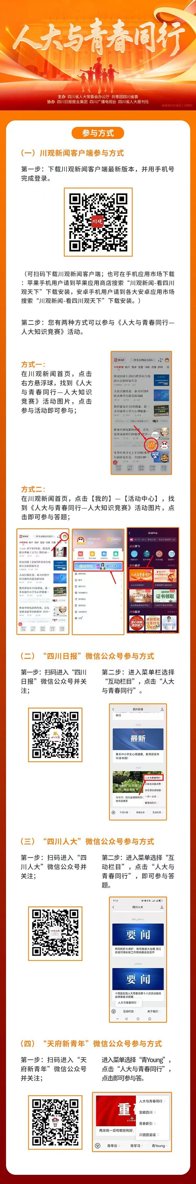 知识竞赛、短视频作品征集如何参与?可通过川观新闻客户端以及四川日报、四川人大和天府新青年微信公众号参与活动,具体如下: