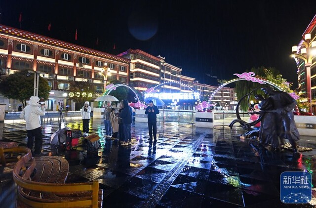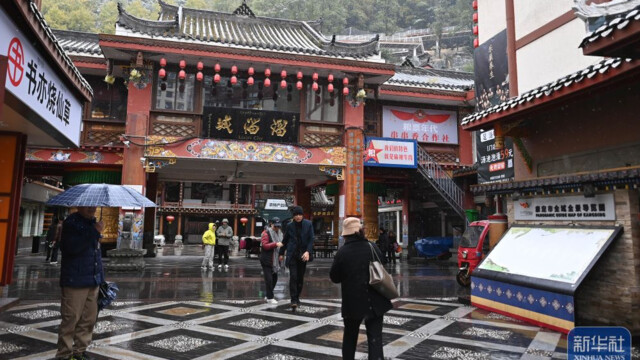 ↑ 11月1日,游客冒雪在四川省甘孜州康定市溜溜城游览。
