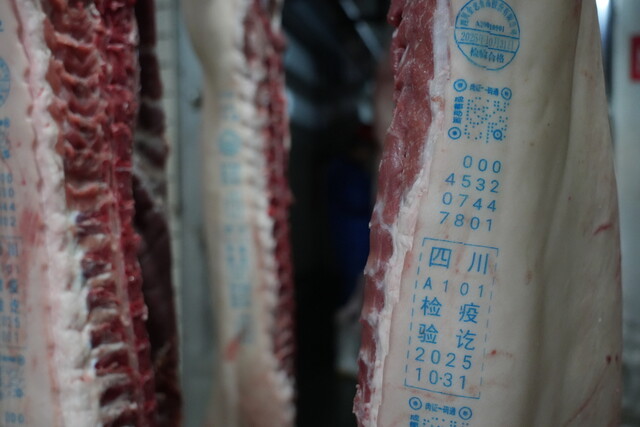 “两证两章”是保障肉产品安全的核心标识体系,也是消费者快速确认肉品合规性的依据。“看见它,就说明这是允许出厂上市的安全合格产品。”该工作人员指着两章中间的二维码介绍,“这就是成都‘肉证一码通’,不仅能扫码查看‘两证两章’,还能对猪肉进行全流程溯源。”