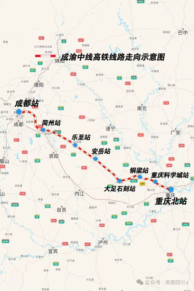 成渝中线高铁是我国“八纵八横”高铁网沿江通道的重要组成部分。线路自重庆枢纽重庆北站起,向西经重庆两江新区、沙坪坝区、璧山区、铜梁区、大足区,四川省资阳市、成都市,引入成都枢纽成都站,正线全长292公里。成渝中线高铁设计时速达400公里,预计2027年底建成通车,将成为全球最快高铁,从成都至重庆50分钟可抵达。