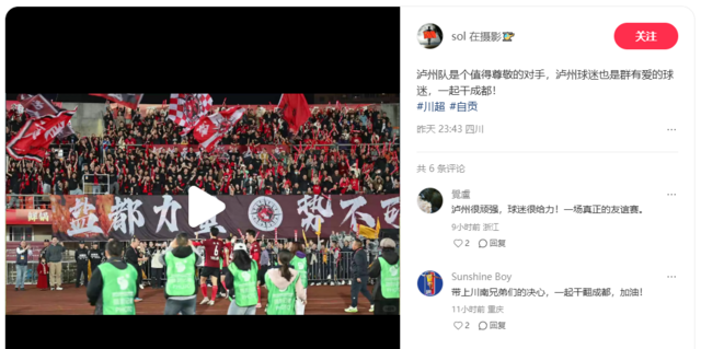社交媒体上,两地球迷的互动汇成暖流,“是对手也是亲人”的真诚赞赏,“泸州队是个值得尊敬的对手”的由衷赞叹,让赛前赛后的“欢迎”与“谢谢”,成了比任何战术都更有力的语言。