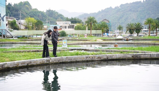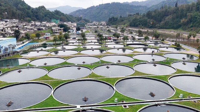 在青山环抱、云雾缭绕的美景下,上百斤重的鲟鱼在流水鱼池里悠闲地游动。这些“大宝贝儿”不时摆动尾巴,溅起水花,享受着安逸生活。