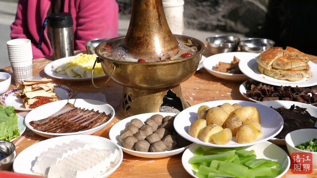 临近正午,备受期待的长街宴正式开席。近30张圆桌沿主干道整齐排开,与远山彩林相映成趣,构成一幅极具烟火气的民俗画卷。桌上铜火锅炭火正旺,清亮高汤翻滚沸腾,新鲜牦牛肉、牦牛肚搭配本地高山菌和时令蔬菜,鲜香扑鼻。