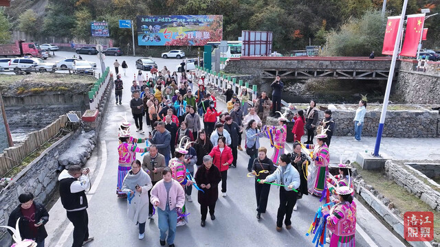 在天母湖观景平台,非遗传承人带领游客举行拜山神祈福仪式,大家在丝带上写下心愿并系于祈福区,让美好期许随山风传递。“彩林美得像画,随手一拍都是大片。”游客石昌隆感慨道,更让他惊喜的是白马藏族文化的厚重,“古老舞步和非遗手艺里,都藏着民族的历史与信仰。”