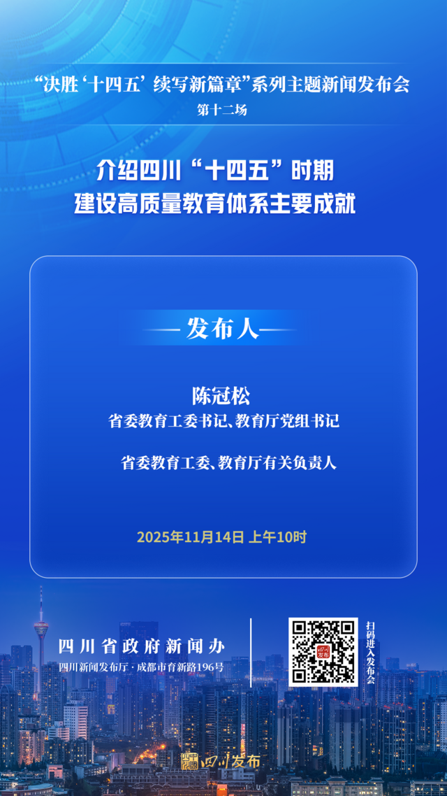 2025年11月14日(星期五)10:00,省政府新闻办将在四川新闻发布厅举行“决胜‘十四五’ 续写新篇章”系列主题新闻发布会第十二场,省委教育工委书记、教育厅党组书记陈冠松围绕四川“十四五”时期建设高质量教育体系主要成就作介绍并答记者问,省委教育工委、教育厅有关负责人参加答记者问。四川发布客户端将全程图文直播,敬请关注!