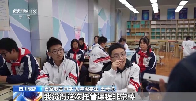 成都石室联合中学九年级学生 王琦玮:平时我就比较喜欢人工智能,但是因为平时课程比较忙,所以就没什么时间去接触,我觉得这次托管课程非常棒。