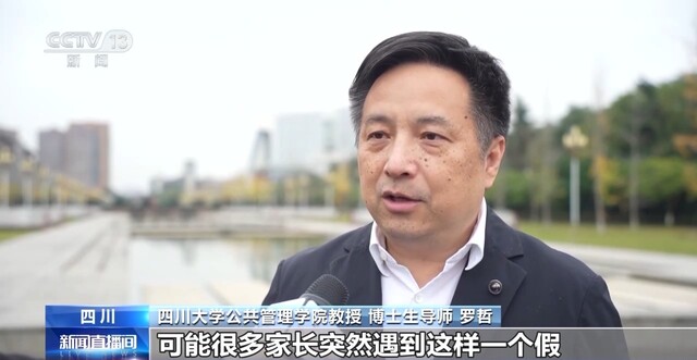 四川大学公共管理学院教授 博士生导师 罗哲:我们用托底+协同来推进,可能很多家长突然遇到这样一个假,觉得年休假休完了等等,不能保证。在这样的特殊情况下,先实行托底,只要家长不方便,我们就用学校和社会的方法来托底。协同是什么?我们的人社和工会部门就协调了劳动者的权益保护和他的假期的合理安排。我们的文化部门就协调了所有的文博资源的开放。