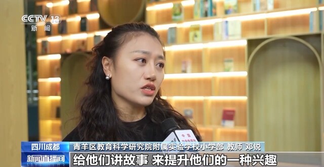 青羊区教育科学研究院附属实验学校小学部教师 邓锐:一到三年级的孩子他们比较喜欢听故事,所以我们就采用绘本来入手,给他们讲故事,来提升他们的兴趣。