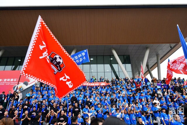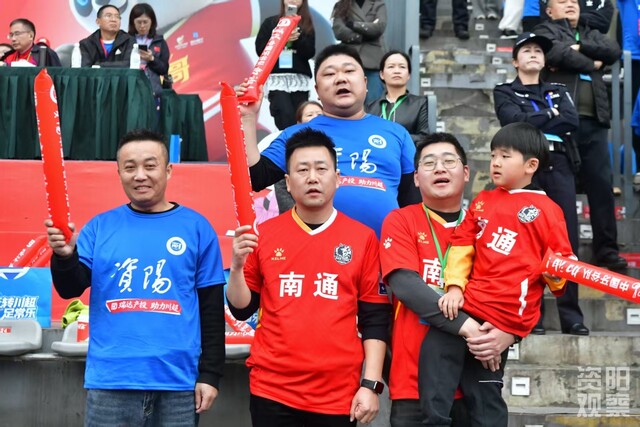 在资阳主场一片蓝色的海洋中,几位身着鲜艳江苏南通支云队红色球衣的球迷格外醒目。他们带着江苏口音的助威声,成为看台上一道独特的风景。