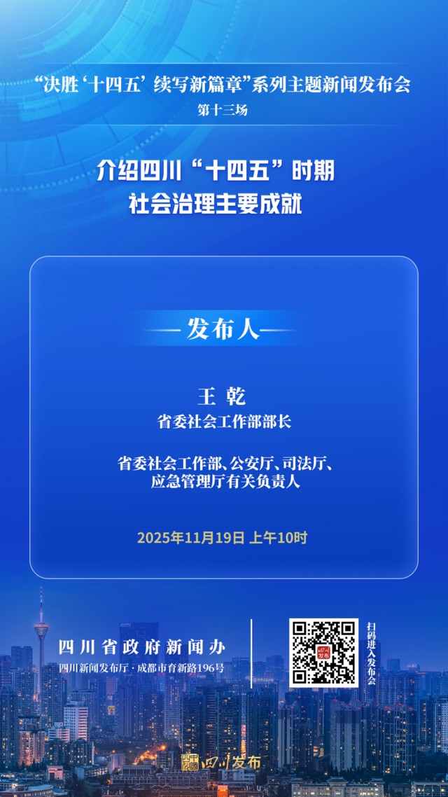 2025年11月19日(星期三)10:00,省政府新闻办将在四川新闻发布厅举行“决胜‘十四五’ 续写新篇章”系列主题新闻发布会第十三场,省委社会工作部部长王乾围绕四川“十四五”时期社会治理主要成就作介绍并答记者问,省委社会工作部、公安厅、司法厅、应急管理厅有关负责人参加答记者问。四川发布客户端将全程图文直播,敬请关注!