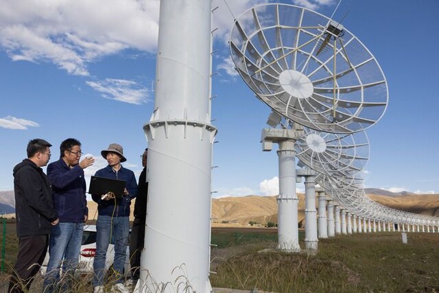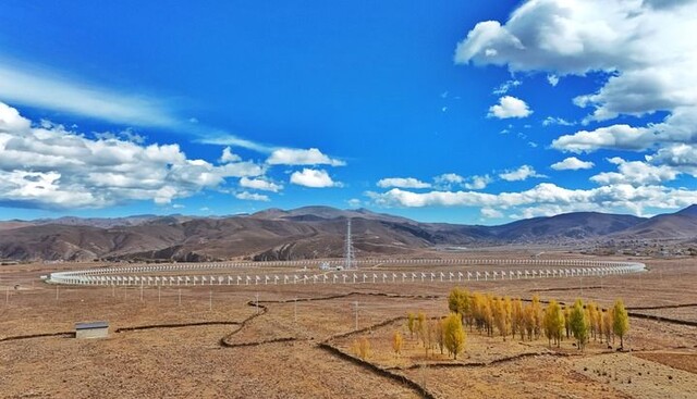稻城县城不远的傍河边,目前全球规模最大的综合孔径射电望远镜——直径1公里、313个6米口径天线组成的“圆环阵”逐日而动,为提升空间天气精准预报能力提供重要支撑……