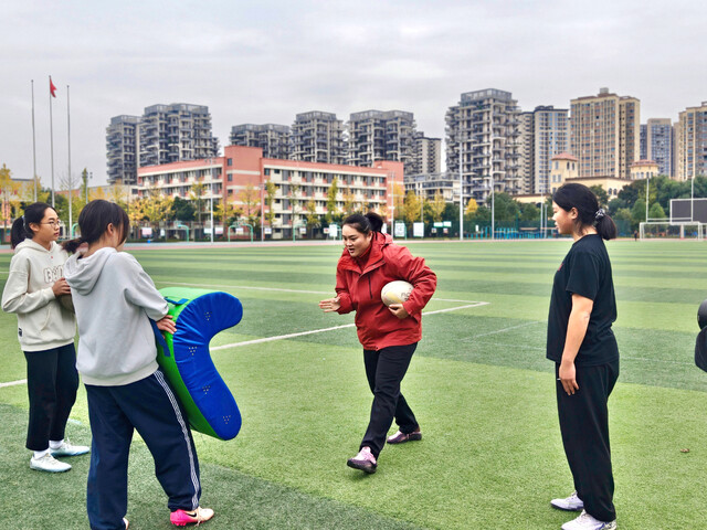 “手臂抬高!注意护球!”晏晓萍的声音在操场上回响。夺得铜牌的老队员已返回各自大学继续学业,如今场上全是稚嫩的新面孔。训练间隙,孩子们常围在一起观看学姐们的比赛回放,那些精彩的扑搂和达阵,成为她们努力追赶的目标。