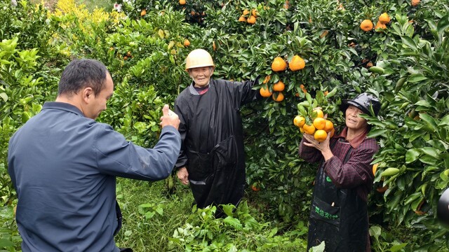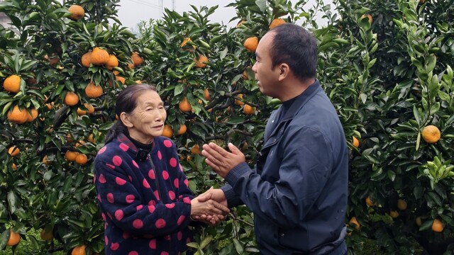 走进12组村民杨婆婆的果园,金黄饱满的蜜柑挂满枝头,果香四溢。罗泽半俯身子钻进果林,一套“看色泽、捏硬度、尝甜度”的“选果三部曲”行云流水。了解品质后,他紧紧握住杨婆婆的手,斩钉截铁地承诺:“您放心,这么好的果子我一定帮您卖出去!”
