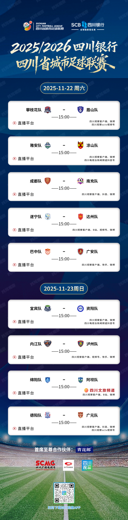2025/2026四川银行四川省城市足球联赛(简称“川超”)分区赛第十轮也就是最后一轮将于11月22日开踢!本轮的9场对决将分别于11月22日(5场)和23日(4场)两个比赛日进行。为了方便各位球迷朋友观赛,观观整理了比赛日程,请查收!