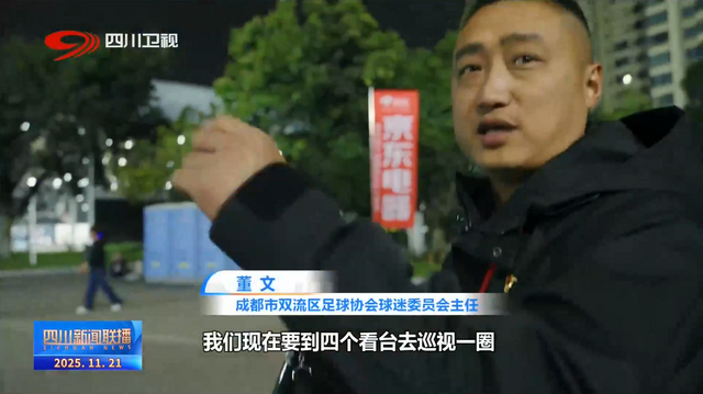成都市双流区足球协会球迷委员会主任 董文:我们现在要到四个看台去巡视一圈,看有没有球迷出现违规的举动。哦,都进球了。心里还是有点痒,想看。