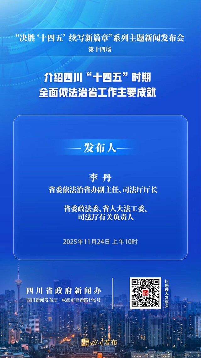 2025年11月24日(星期一)10:00,省政府新闻办将在四川新闻发布厅举行“决胜‘十四五’ 续写新篇章”系列主题新闻发布会第十四场,省委依法治省办副主任、司法厅厅长李丹围绕四川“十四五”时期全面依法治省工作主要成就作介绍并答记者问,省委政法委、省人大法工委、司法厅有关负责人参加答记者问。四川发布客户端将全程图文直播,敬请关注!