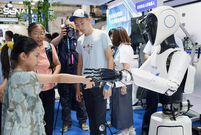 2025世界机器人大会上,“四川造”机器人产品和市民互动。(受访者供图)