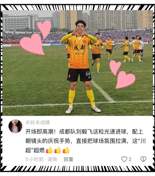 成都队66号球员刘毅飞,进球后难掩兴奋