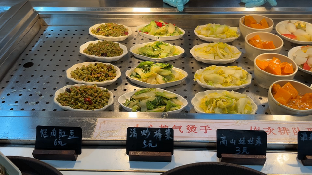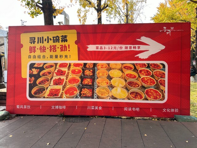一进川博的寻川·博物馆生活体验中心餐厅,瞬间被排满柜台的小碗菜惊到——60多种菜品涵盖凉菜、炒菜、炖菜、蒸菜,妥妥的川味家常菜合集。3元就能get清爽开胃的川北凉粉、凉拌茄子,5元的麻婆豆腐麻辣鲜香,12元的回锅肉、板栗红烧肉直接把荤菜性价比拉满。算下来一荤一素一汤,人均20块出头就能吃得满足,难怪不到中午就排起长队,座无虚席。