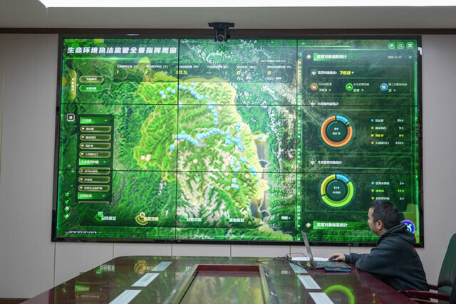 在九寨沟县生态环境局执法中队的生态环境执法监管全景指挥平台上,一张覆盖1000多个各类污染风险点位的县域卫星地图,在大屏幕上动态呈现监测情况。九寨沟生态环境局局长何有凯说,生态、林草、应急多部门共同开展专项执法检查,联合无人机巡航巡查,确保生态保护不留死角。