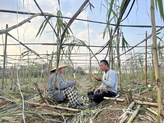 穿着格子围裙戴着草帽的小徐和村支书正在等待“甘蔗哥”,商讨具体的人员排班、网络、照明等细节。
