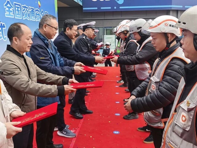 进入到颁奖环节,交警为小朋友颁发“小小交通安全员”证书,为10名美团文明骑手、10名滴滴代驾文明驾驶人以及文明交通共建学校、社区、公交公司、商圈、企业等颁发证书。