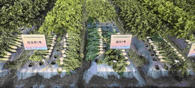 这几日,正在举行的第11届成都种业博览会(秋季)蔬菜新品种田间展示会试验田里,几十种大大小小,形状各异的白萝卜排列在一起。