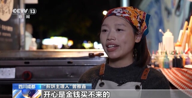 “煎饼主理人” 曾雅鑫:我做完煎饼,好累,腰好痛,但一翻煎饼他们就,哇!我就又可以了,感觉又充电了。最开始的时候,我是为了生活,现在我是为了让更多的消费者喜欢我的饼。他们开心,我就会开心,我和客户应该是双向奔赴的。