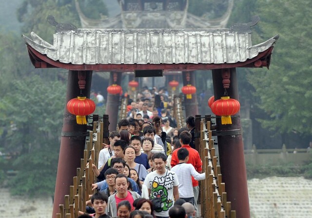 2013年10月4日,游客在四川都江堰景区游览。新华社记者 薛玉斌 摄