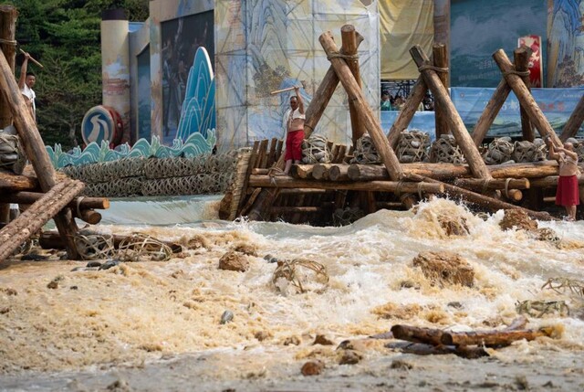 这是一场与时间赛跑的盛大劳作:人们将粗壮原木扎成三角“杩槎”,连排置于江中,再压上装满卵石的竹笼,覆以竹笆、黏土,便在江心筑起一道临时堤坝,将江水引开。随后是最关键的清淤,工匠们跃入刺骨的江水,挥锄挖掘河床,直到触到深埋的“卧铁”方止。“卧铁”是深淘的尺度,是千年经验的物化。而飞沙堰的修复高度,也严格遵循着卧铁之上两米的祖制——过高则沙石难排,过低则宝瓶口引水不足。
