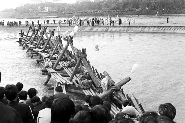 1990年4月5日,四川省数万人在都江堰渠首隆重集会恢复传统的放水仪式。都江堰每年冬天都要断水岁修,第二年清明节举行放水仪式,已有1000多年历史。1957年都江堰渠首安装了电控闸门,放水仪式中断,33年后的今天又恢复了这一古老的仪式。工人们正把拦水的杩槎砍去拉开,让都江堰水灌溉百万顷良田。新华社记者吴祖政摄