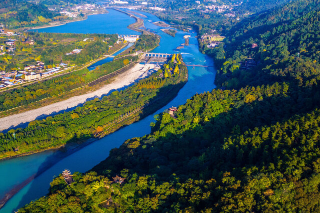 当人们登顶秦堰楼,目之所及,彩林斑斓,岷江滔滔,奔流不息的江水经鱼嘴分水、飞沙堰排沙、宝瓶口控流,沿着玉垒山奔向繁华的成都平原……才得以直观感知2281年前秦国蜀郡郡守李冰敢为天下先的开创之举。