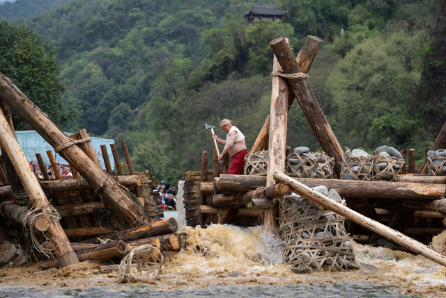 2006年4月5日,都江堰清明放水节上,“河工”拉开拦河的杩槎开始放水。当日,四川省都江堰市举行清明放水节,以纪念蜀郡太守李冰修筑都江堰。已经有2000多年历史的都江堰水利工程至今依然浇灌着川西1000多万亩良田。新华社记者陈燮摄