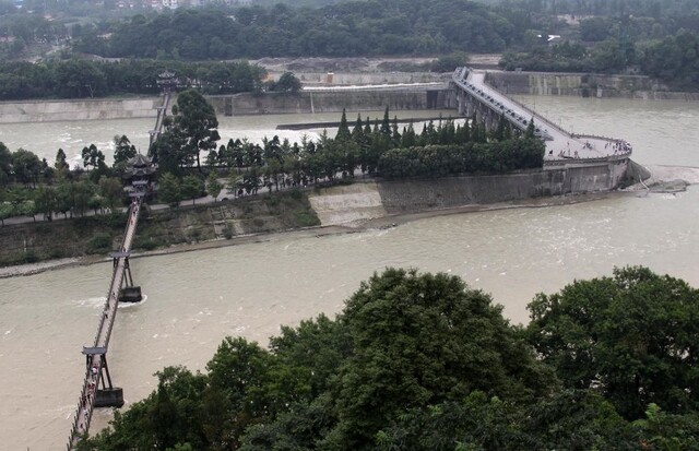 成都平原西部,岷江从高山峡谷进入平原地区,地势的急剧变化使得水流变得湍急。