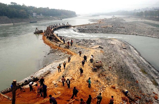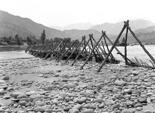 四川灌县都江堰的截流工程——杩槎,用它可以将水挡住,以免从外江流入内江(1958年5月整理)。新华社记者吴化学摄