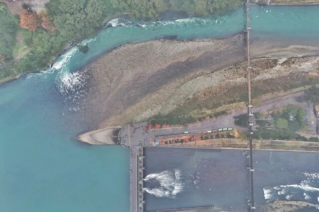 鱼嘴分水堤因形似鱼的嘴巴而得名,堤身用沙石堆砌而成,宽厚结实,又名金钢堤。岷江水在这里被鱼嘴分为内外两江。图中下边是岷江的正流叫外江,主要用于泄洪排沙。上边是内江,是李冰开掘的人工河。新华社记者 刘坤 摄