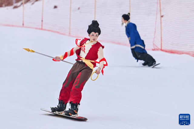 12月8日,一名装扮成哪吒的表演者在阿坝州汶川县羌人谷滑雪场进行滑雪表演。