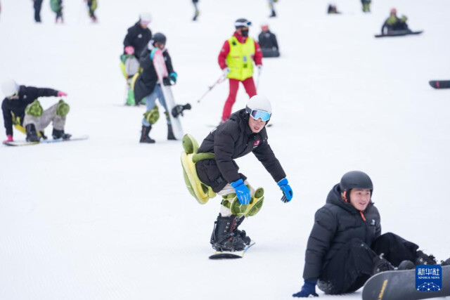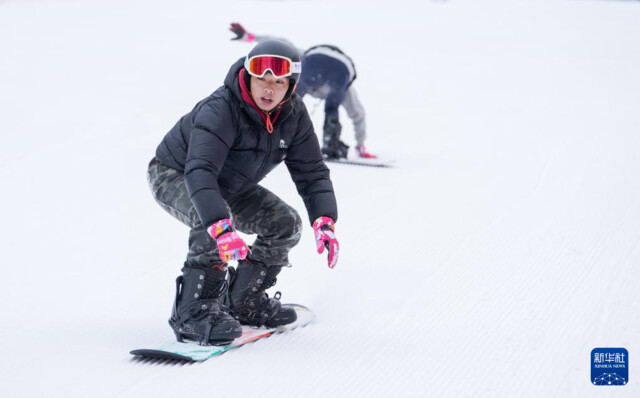 2月8日,游客在阿坝州汶川县羌人谷滑雪场滑雪。