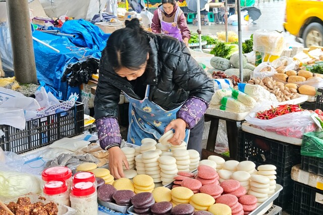 镇雄县坡头镇初级中学大门前的集市上售卖的五颜六色的小糍粑
