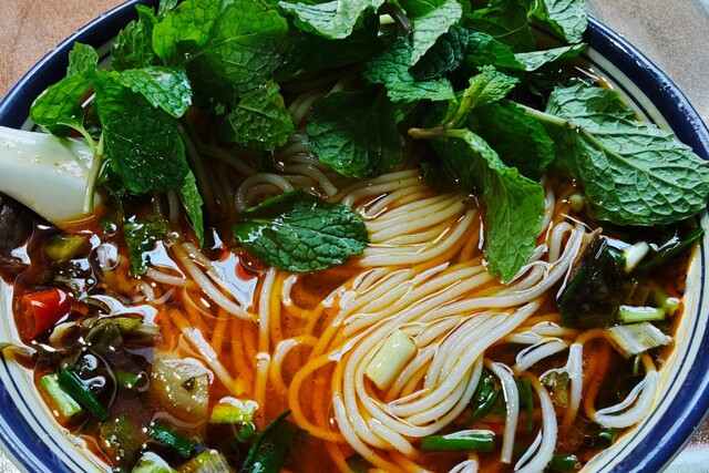 一口温暖解腻的酸汤,是三省美食篇章中最经典的注脚,但酸汤菜肴和层次却因地域略有不同。近年来,鸡鸣三省大桥的通车带来了交通的便利,让更多的泸州人自驾去贵州品尝酸汤牛肉。毕节七星关区林口镇一家农家饭馆里,大口砂锅咕嘟作响,红酸汤浮着金黄的油花,涮上坨坨牛腩肉,一屋子酸香惹人馋涎欲滴。老板李哥不时走进来给一桌四川客人加汤:“四川朋友好多都爱吃薄荷叶,汤头还加了点云南的香茅草和草果,不知道你们吃得惯不,店里还有怪噜饭,要吃就喊。”