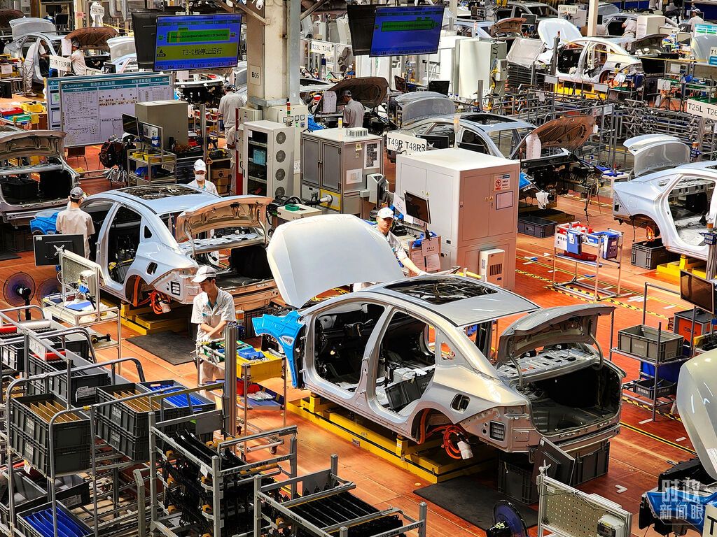△国内一家车企制造车间的新能源汽车生产线。(图/视觉中国)