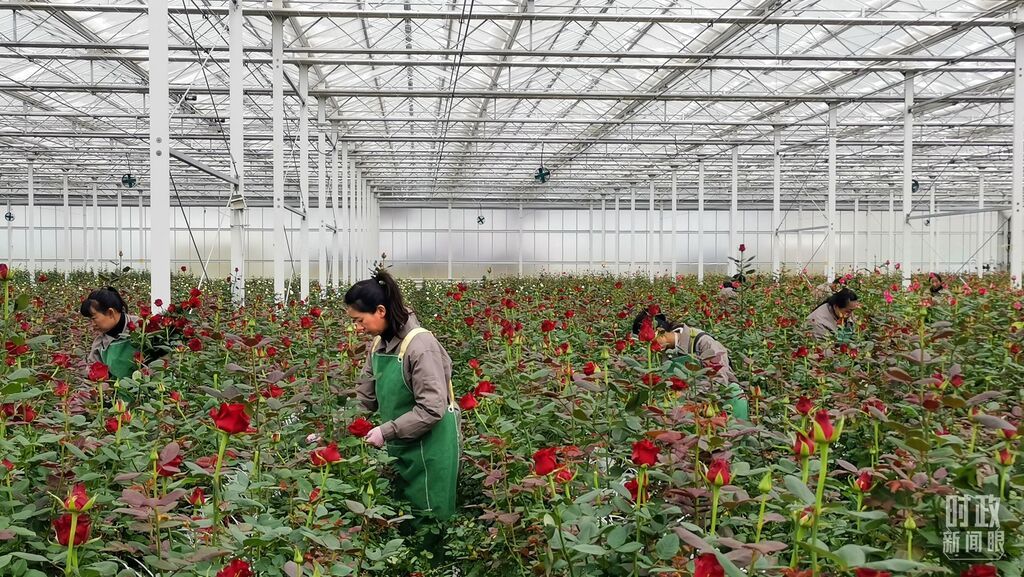 △工人们在云南丽江现代花卉产业园里的智能温室大棚里劳作。(总台央视记者范一鸣拍摄)