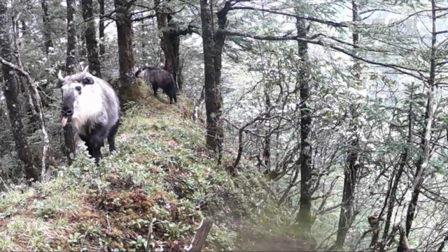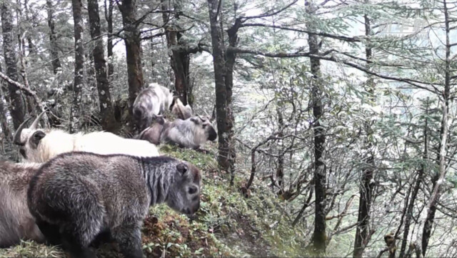 近日,四川省松潘县林业和草原局架设在岷江自然保护区的红外相机再次成功捕捉到国家一级保护野生动物羚牛的活动影像。