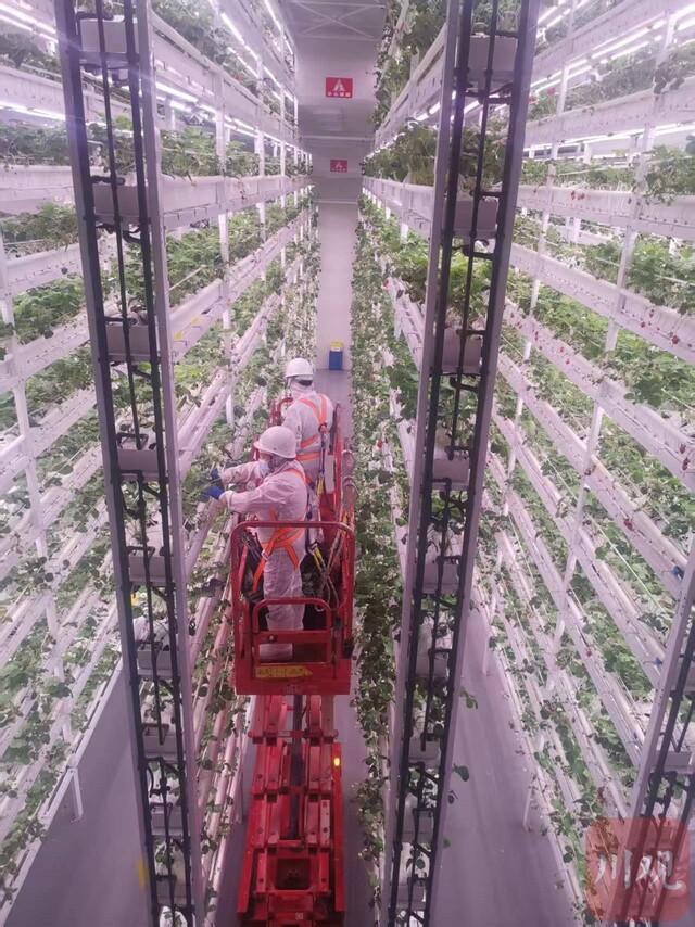 立体草莓智慧工厂草莓采摘现场。
