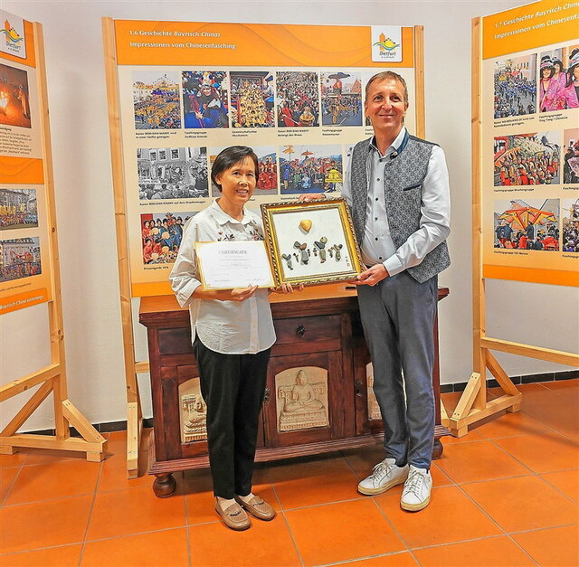 涪江奇石贴画《凝聚》被德国迪特福特中国博物馆永久性收藏,图为迪特福特市市长伯纳德·迈尔为吴晓娟颁发收藏证书。(受访者供图)